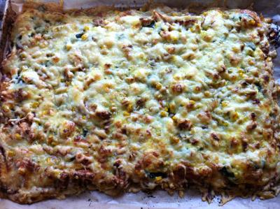 Nach Packungsangabe des Ferigteiges in den Backofen und geduldig warten, bis der Käse schmilzt, Dich anlacht, verführerisch durchs ganze Haus riecht, goldbraun ist...