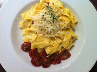 Mascarpone statt Sahne ist ziemlich genial und durchwachsener Speck statt Schinkenwürfel löst auch keine überflüssigen Pfunde auf, schmeckt aber herrlich!